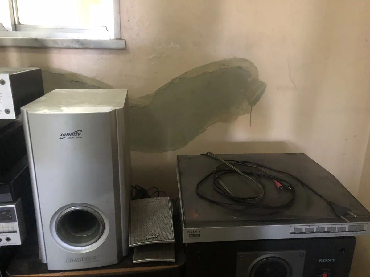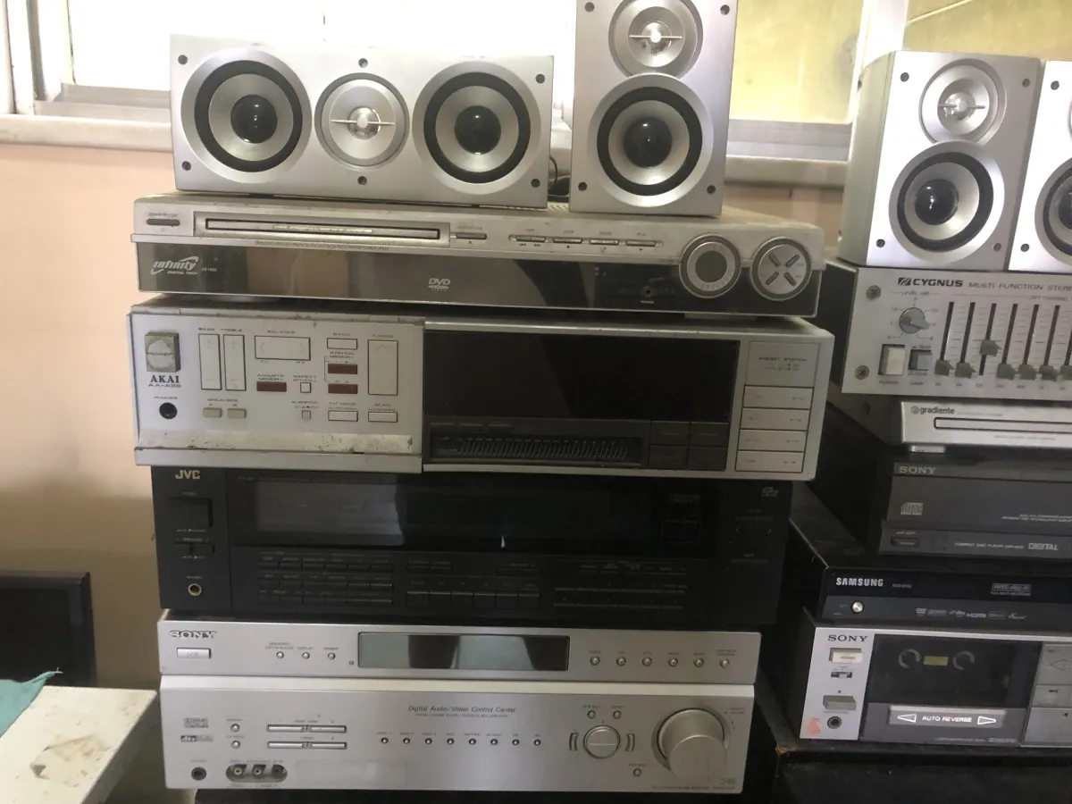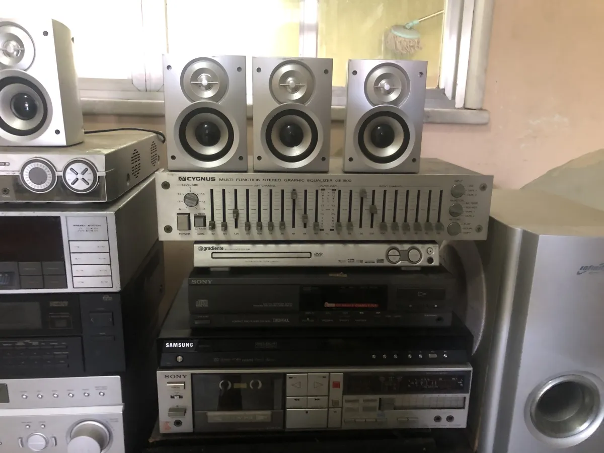 Conjunto de som com 4 caixas, receiver, toca disco, toca caceti, CD, etc.