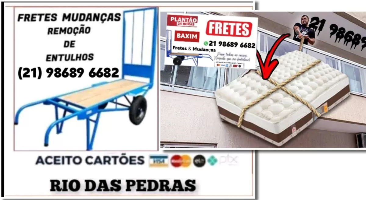 Faço fretes,mudanças,descarte de entulhos e içamentos de móveis na corda dentro da comunidade de Rio das Pedras de domingo a domingo e feriados 24hs . Serviços com burrinho sem rabo . Mas ágil e prático pra quem vai se mudar dentro dos becos e vielas da comunidade . Meu ZAP 2198689 6682
